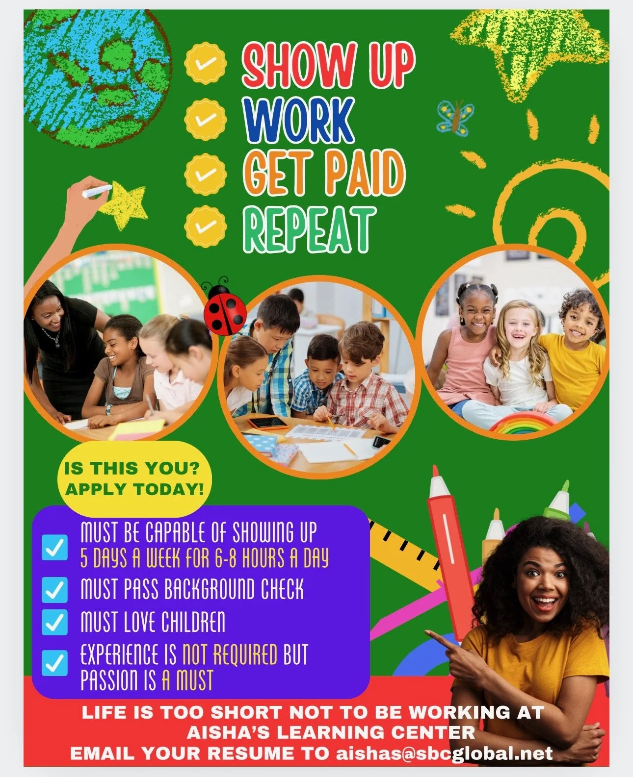 At Aisha’s, we believe in showing up, making a difference, and getting paid to do what you love! If you’re passionate about working with children, ready to grow in a nurturing environment, and believe that learning through play matters—you just might be a perfect fit. No experience? No problem. Passion is what we’re looking for. Apply today and become part of something meaningful!